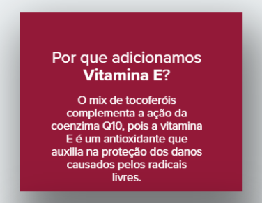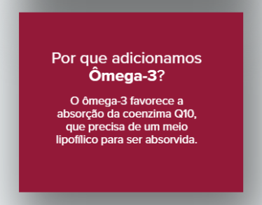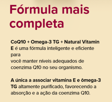 Fórmula desenvolvida para suplementar de uma maneira eficiente a coenzima Q10, uma substância que tem relação direta com o bom funcionamento e desempenho das nossas células, e encontra-se em maior concentração nos órgãos que necessitam de muita energia, como músculos, cérebro e coração.